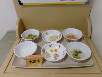 中期食:おかゆ、かぼちゃ、ねぎ、鶏肉だし煮、ブロッコリー汁