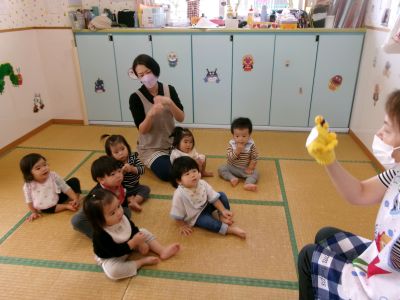 「ころころたまご」「一匹ののねずみ」みんな集中して見ています。