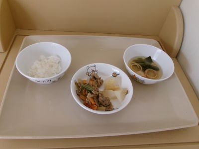 幼児食:ご飯、豚肉の生姜焼き、ふろふき大根、みそ汁