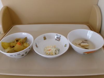 幼児食:カレーライス、マカロニサラダ、すまし汁