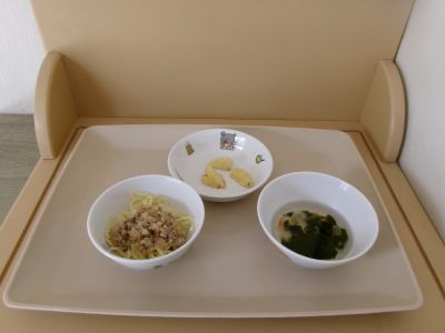 幼児食:ジャージャー麵、青のりポテト、すまし汁