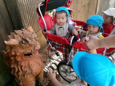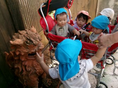 シーサーのくちに手を入れたり、葉っぱを入れたり(^.^)遊んでいます。
