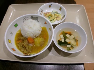 幼児食:カレーライス、マカロニサラダ、すまし汁