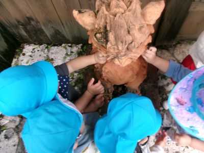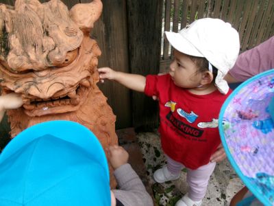 大きなシーサーともお友達(^^♪みんな一斉に近づいていきます