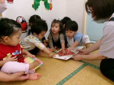 朝のおやつ前の読み聞かせタイム(^O^)大好きな絵本『きんぎょがにげた』みんなで逃げた金魚を探しています👀