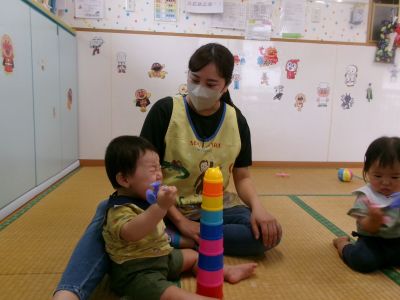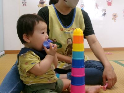 カップを乗せて乗せて・・保育者と遊びながらママを思い出すKくん(´;ω;`)ウッ…