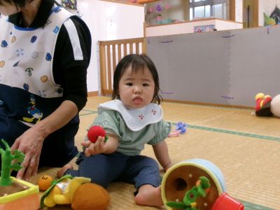 少しずつお部屋と保育者にも慣れて、好きなおもちゃを選んで遊ぶようになりましたよ。