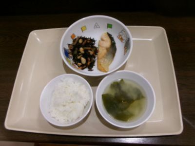 鮭のカレームニエル、ひじき炒め、みそ汁です。