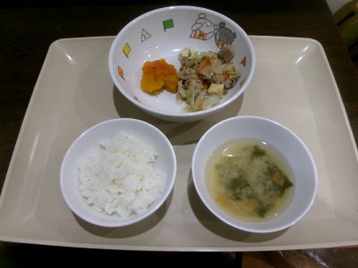 幼児食:ご飯、豆腐チャンプルー、かぼちゃの煮物、みそ汁