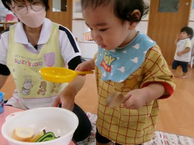 中期食:おかゆ、豚肉だし煮、かぼちゃ、たまねぎだし煮、汁(キャベツ)