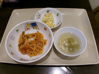 幼児食:ナポリタンスパゲッティ、卵サラダ、すまし汁