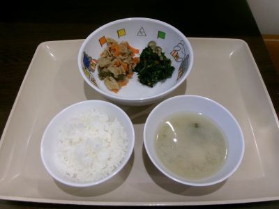 幼児食:ごはん、豚肉の生姜焼き、ほうれん草の胡麻和え、みそ汁