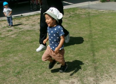 「Mちゃん!ジャンプ!」と言うと片足をあげて飛ぶ姿を見せてくれます。Mちゃんは本気で飛んでるつもりでいます(笑)