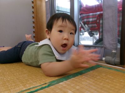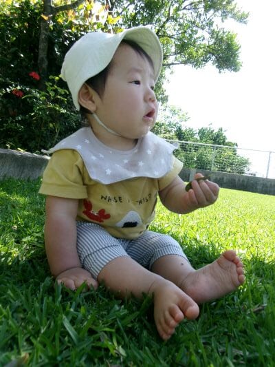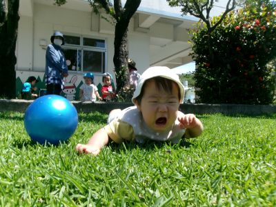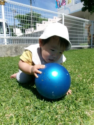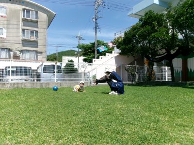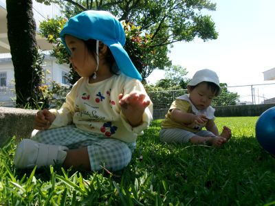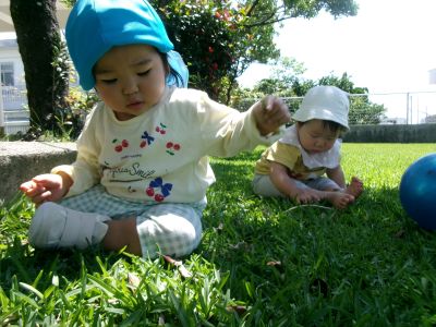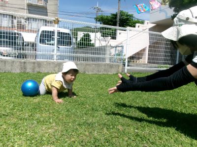 少しずつ芝生の感触にも慣れ始め、遊ぶようになってきたKくん☆