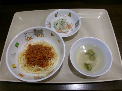 幼児食:ミートソーススパゲティ、ツナサラダ、すまし汁